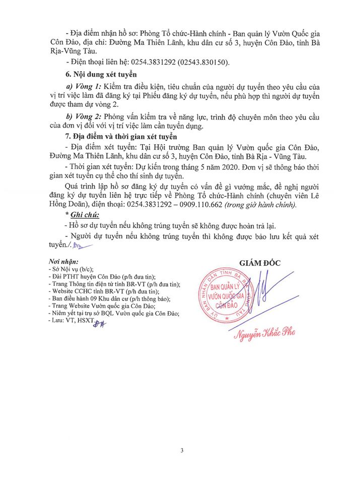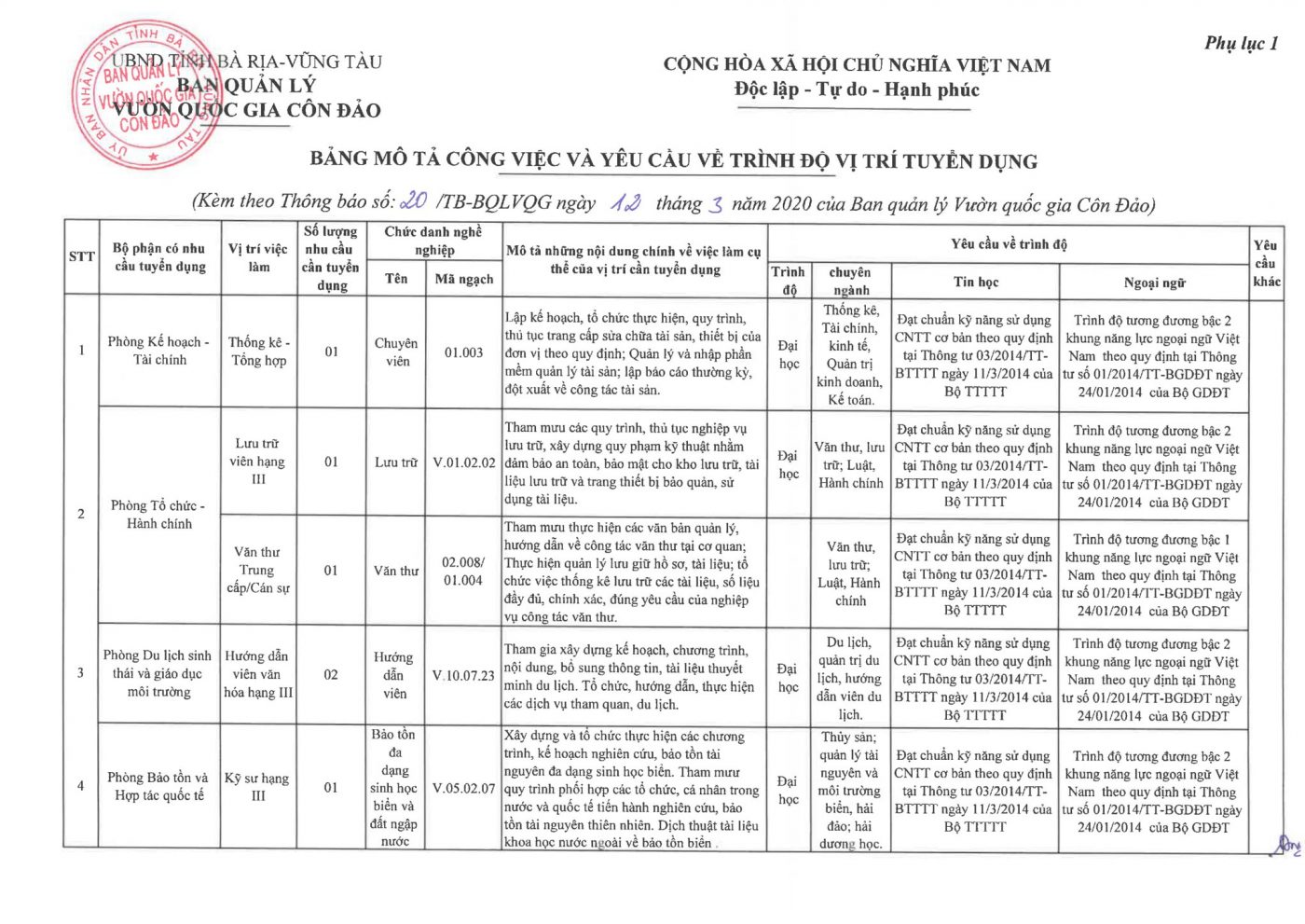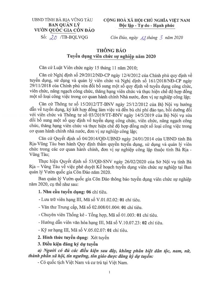 BQL Vườn Quốc Gia Côn Đảo thông báo tuyển dụng tuyển dụng viên chức sự nghiệp năm 2020, cụ thể như sau: