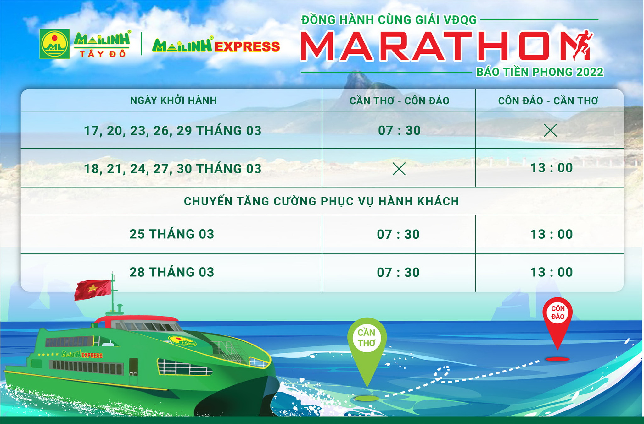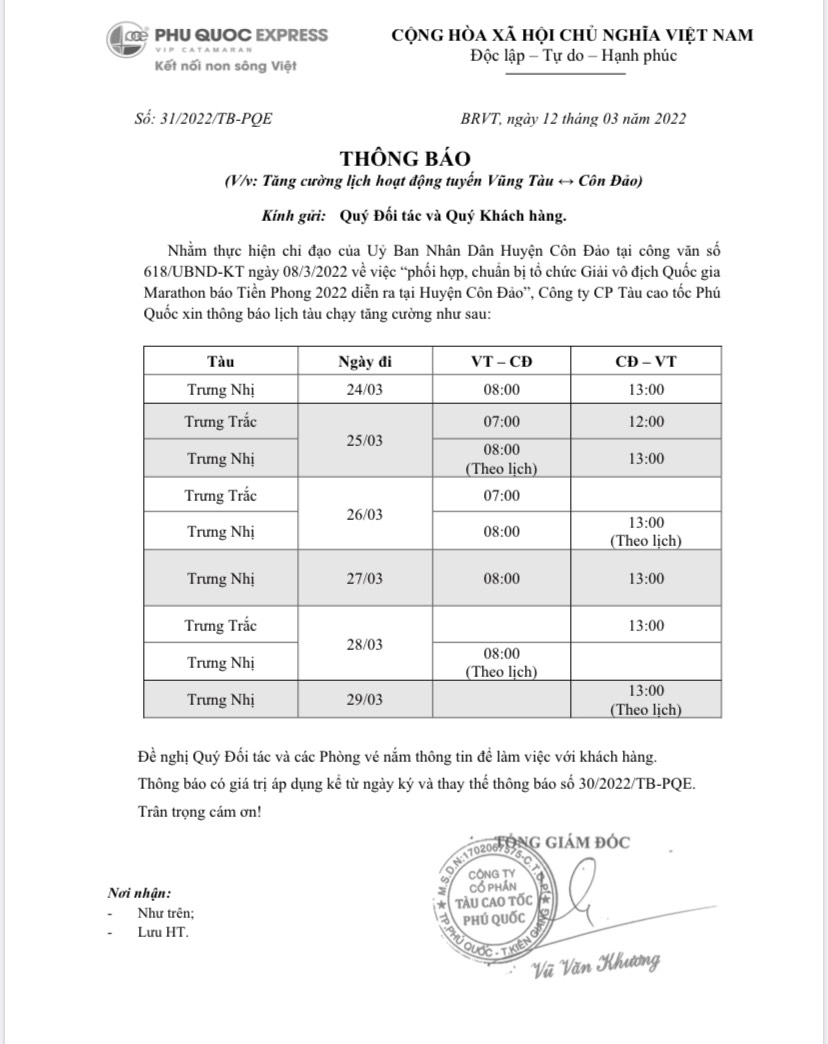 Thực hiện theo công văn của UBND Huyện Côn Đảo về việc phối hợp, chuẩn bị tổ chức Giải vô địch quốc gia Marathon báo Tiền Phong 2022, Công ty Cổ phần tàu cao tốc Phú Quốc, Công ty Cổ phần Mai Linh Tây Đô, Công ty CP Tàu cao tốc Superdong – Kiên Giang sẽ tăng cường chuyến để đáp ứng nhu cầu đi lại của Vận động viên, Ban Tổ chức, Khách mời và Khán giả cổ vũ trong giải đấu uy tín và có tuổi đời lâu nhất của thể thao Việt Nam.