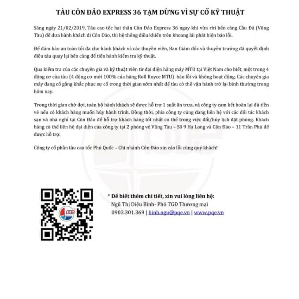 Thông báo ngừng tàu Côn Đảo Express 36 ngày 21/02/2019