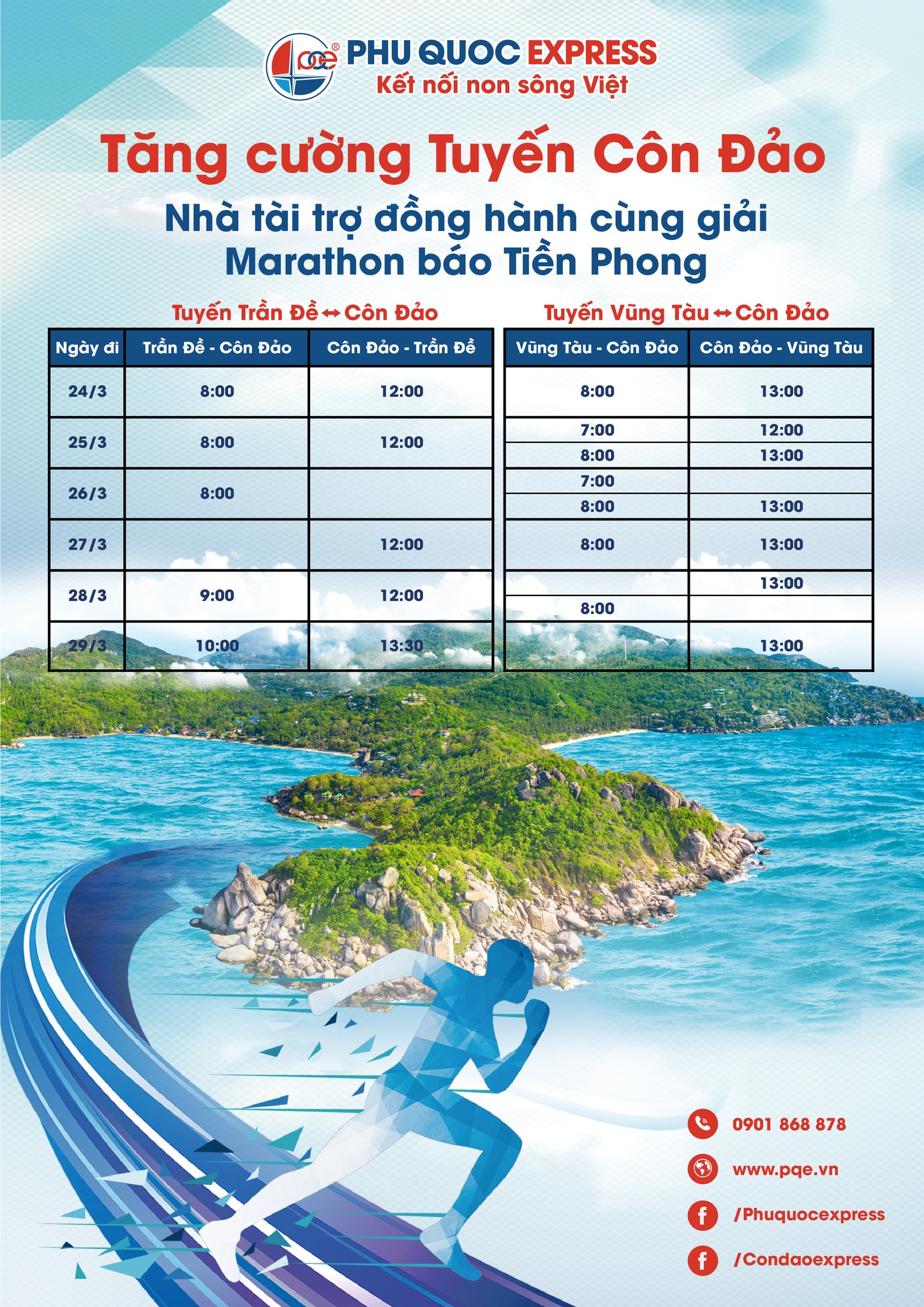 Tàu cao tốc Côn Đảo Express tăng cường các chuyến tàu trong dịp tổ chức giải Tiền Phong Marathon 2022 nhằm đáp ứng nhu cầu đi lại của các vận động viên, ban tổ chức, khách mời và khán giả cổ cũ trong những ngày diễn ra sự kiện.