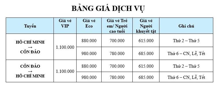 Theo đó, mức giá vé tuyến TPHCM – Côn Đảo sẽ dao động từ 615.000 đồng – 1,1 triệu đồng/lượt tuỳ theo đối tượng hành khách, hạng vé và thời điểm xuất phát. Mức giá này nhỉnh hơn 1 chút so với tuyến Vũng Tàu – Côn Đảo hiện nay.