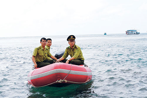 Tuy vậy, khác với công việc của các đồng nghiệp ở trong đất liền, công việc của ông Văn Anh và hơn 60 kiểm lâm viên ở đây không chỉ bảo vệ rừng, mà còn phải bảo vệ nguồn lợi thủy sản dưới biển. Sau quãng thời gian ngắn “chào hỏi” như vậy, chúng tôi bắt đầu đi “tuần biển” cùng Đội Kiểm lâm cơ động.