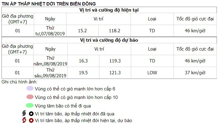 Vùng nguy hiểm trên Biển Đông từ 1 giờ ngày 7/8 đến 1 giờ ngày 8/8 (gió mạnh cấp 6, giật cấp 8): phía Bắc vĩ tuyến 14,0 độ Vĩ Bắc; phía Đông kinh tuyến 117,0 độ Kinh Đông. Cấp độ rủi ro thiên tai là cấp 3.