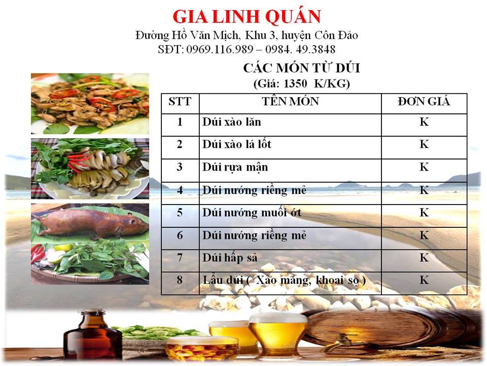 Gia Linh Quán có địa chỉ tại đường Hồ Văn Mịch, khu 3, huyện Côn Đảo chuyên phục vụ các món ăn truyền thống, nguồn thực phẩm được đánh bắt và nuôi thả tự nhiên.
