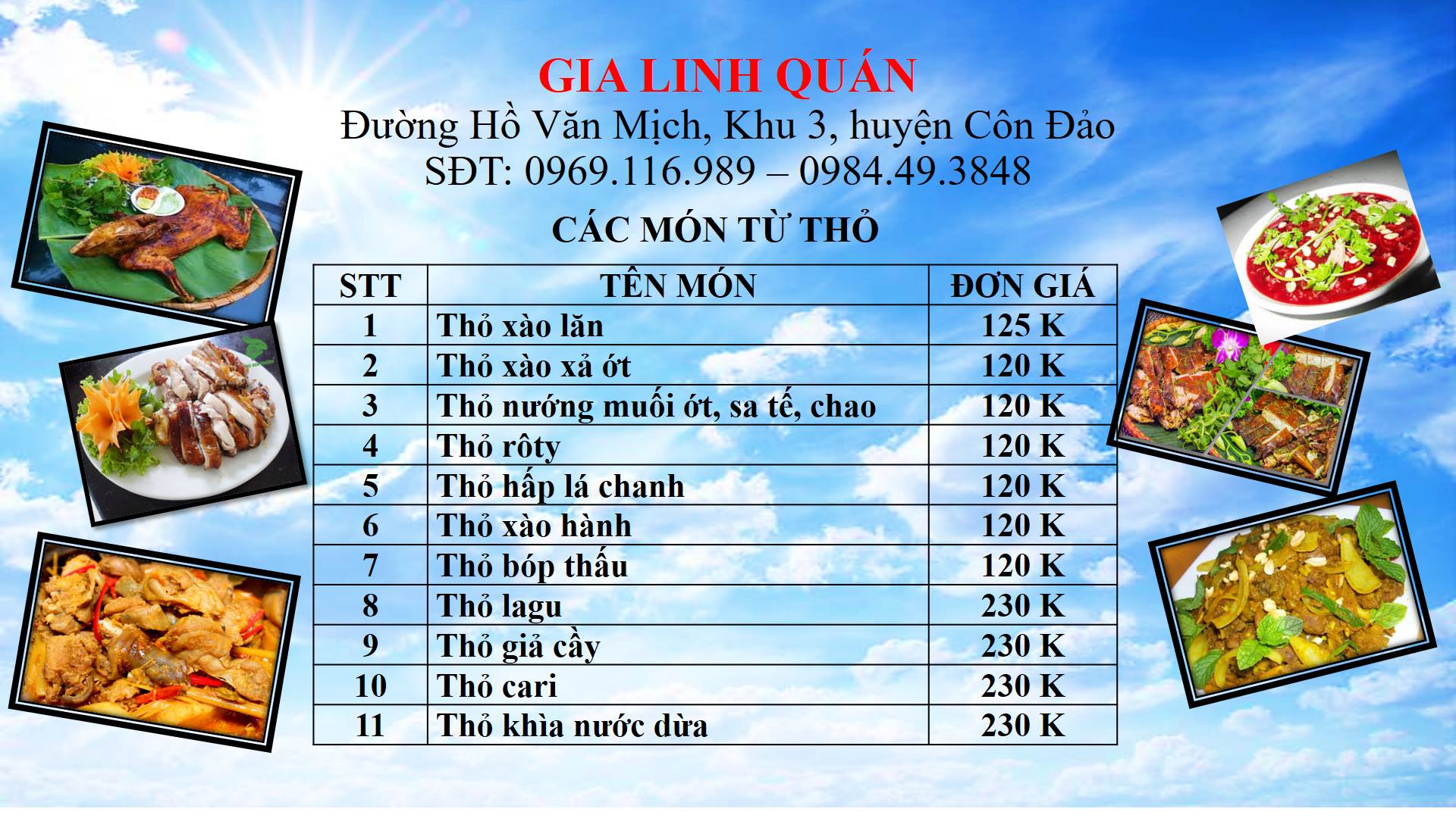 Gia Linh Quán có địa chỉ tại đường Hồ Văn Mịch, khu 3, huyện Côn Đảo chuyên phục vụ các món ăn truyền thống, nguồn thực phẩm được đánh bắt và nuôi thả tự nhiên.