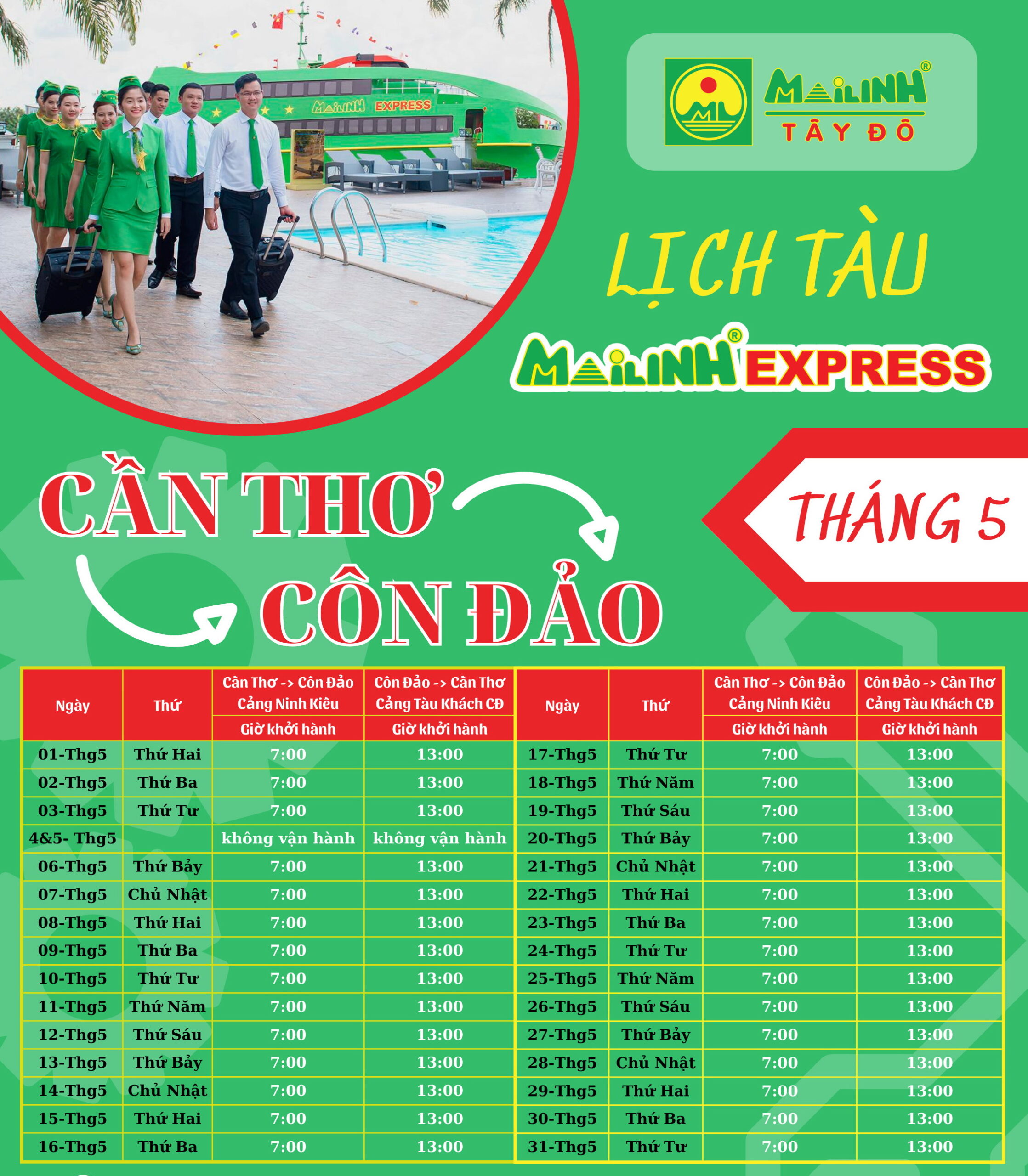 Tàu cao tốc Mai Linh xin thông báo lịch vận hành tàu cao tốc Mai Linh Express tuyến Cần Thơ – Côn Đảo – Cần Thơ trong tháng 5 như sau:
