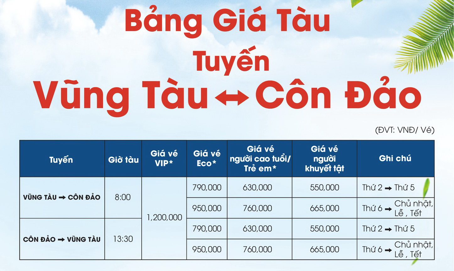 | Côn Đảo về Vũng Tàu | 2, 5, 6, 7, 9, 12, 13, 14, 16, 19, 20, 21, 22, 23, 24, 25, 26, 27, 28, 29, 30/4, 1/5 | 13:00 |
