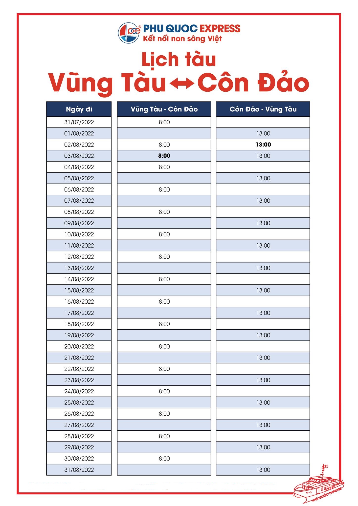 | Vũng Tàu – Côn Đảo | 2, 3, 4, 6, 8, 10, 12, 14, 16, 18, 20, 22, 24, 26, 28, 30/8 | 08:00 |