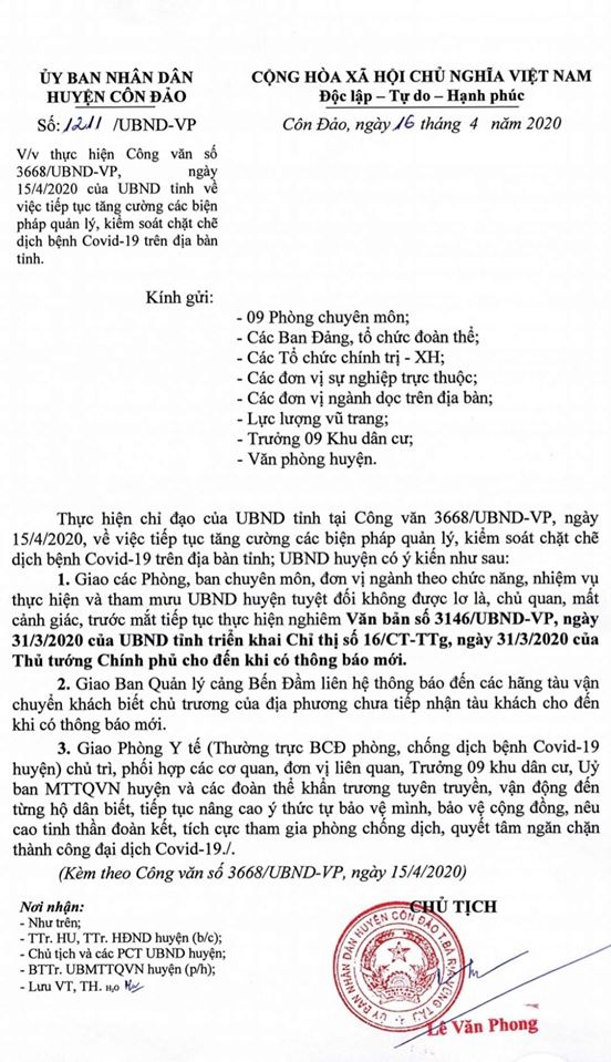 Trước đó, ngày 27/3/2020 UBND huyện Côn Đảo cũng đã có công văn gửi các hãng tàu cao tốc, hãng máy bay trong đó đề nghị chỉ giải quyết bán vé phục vụ đi lại cho người dân vì mục đích cần thiết.