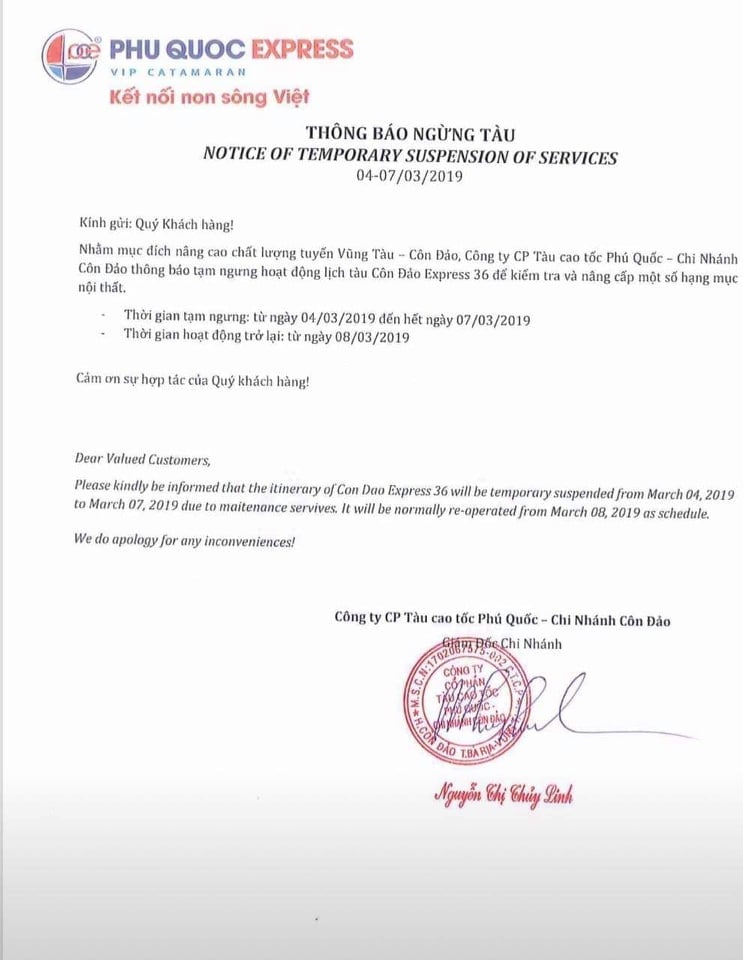 Sau thời gian khởi động trên tuyến Vũng Tàu – Côn Đảo, Tàu Côn Đảo Express 36 sẽ tạm ngừng hoạt động để kiểm tra và bảo trì máy. Tàu sẽ xuất hiện trở lại với sự chuẩn bị tốt hơn nữa nhằm mục đích phục vụ Quý khách những hải trình êm ả chuẩn 5 ⭐