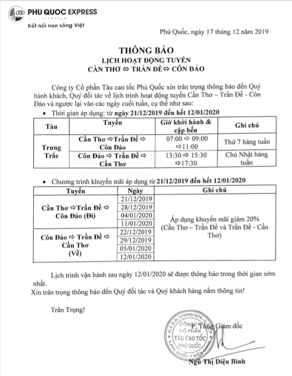 Nhằm đáp ứng nhu cầu đi lại thuận tiện cho người dân và du khách đến Côn Đảo. Công ty Cổ phần Tàu cao tốc Phú Quốc xin thông báo đến Quý hành khách, Quý đối tác lịch trình vận hành tuyến Cần Thơ – Trần Đề – Côn Đảo và ngược lại vào các ngày cuối tuần, cụ thể như sau: