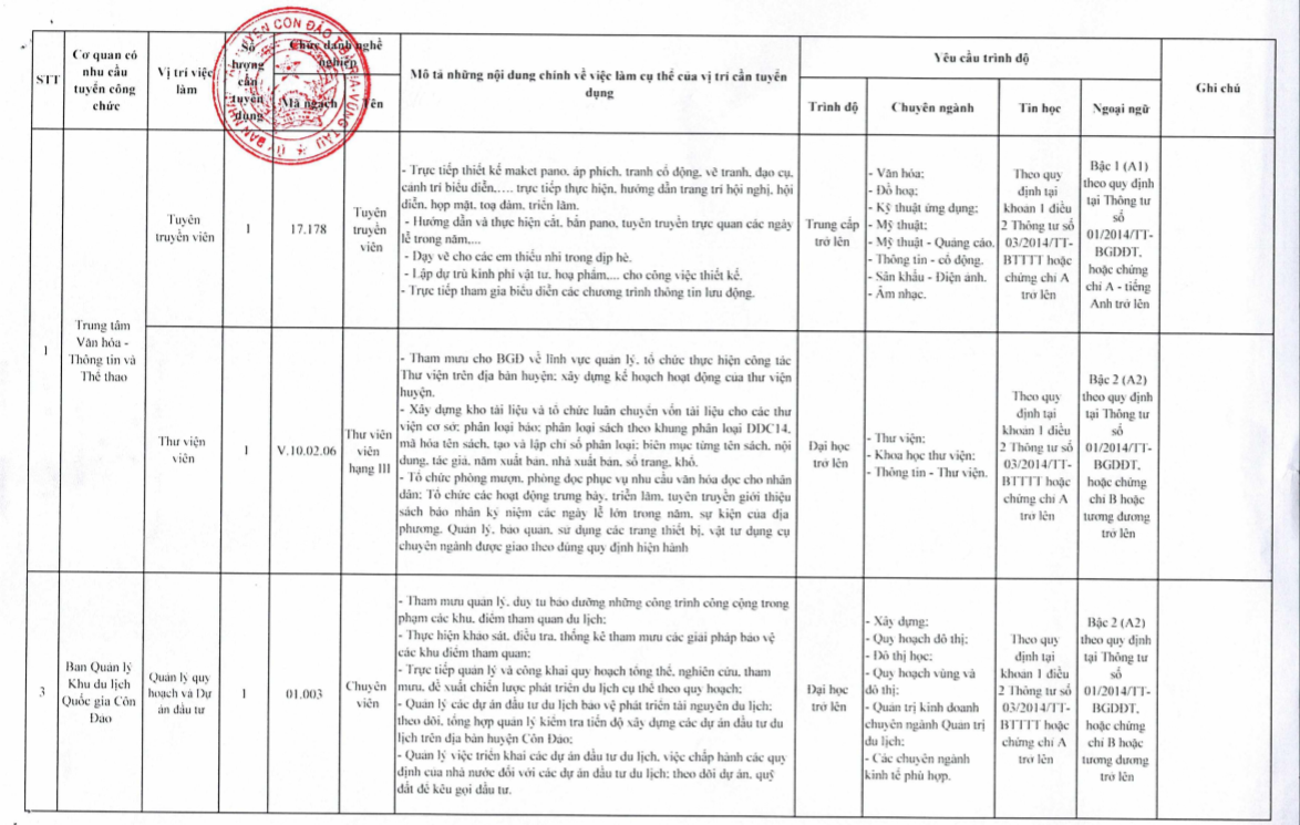 - Ban Quản lý khu du lịch Quốc gia Côn Đảo: 01 chỉ tiêu.