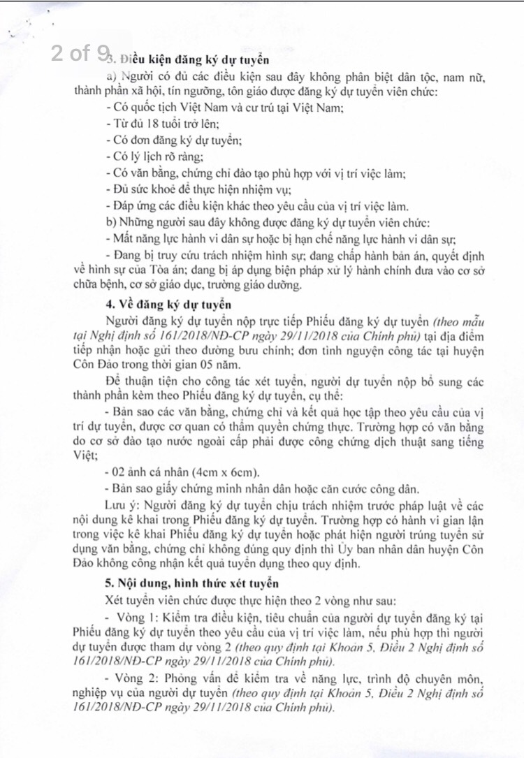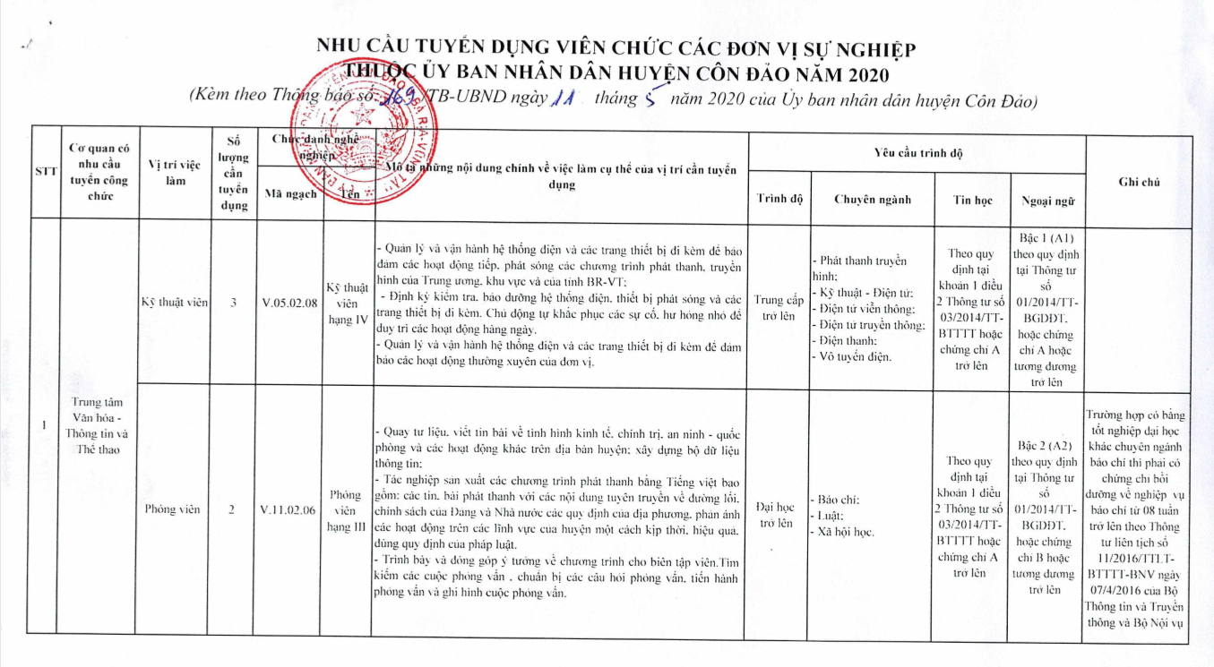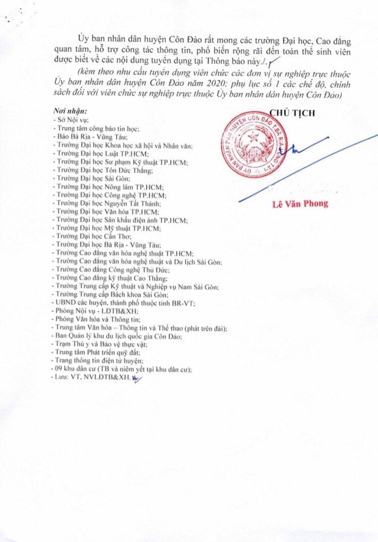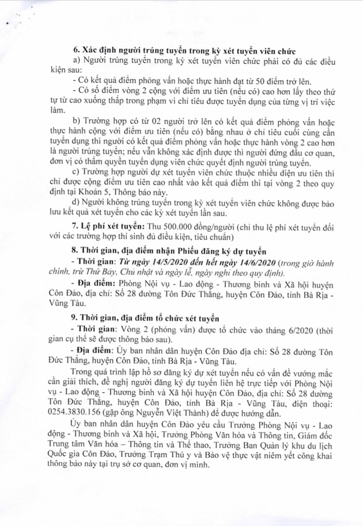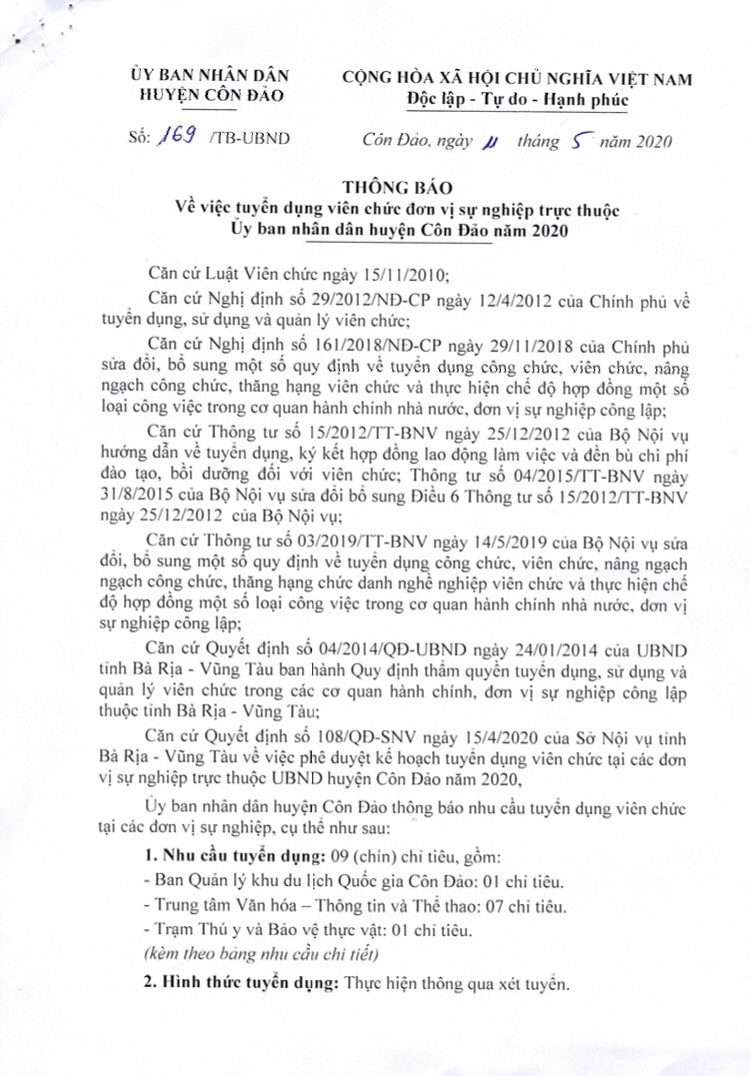 Ngày 11/5/2020, UBND huyện Côn Đảo ban hành Thông báo số 169/TB-UBND về việc thông báo tuyển dụng viên chức đơn vị sự nghiệp trực thuộc Ủy ban nhân dân huyện Côn Đảo năm 2020.