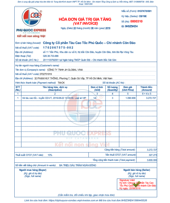 Tra cứu hóa đơn giá trị gia tăng tàu cao tốc Côn Đảo Express